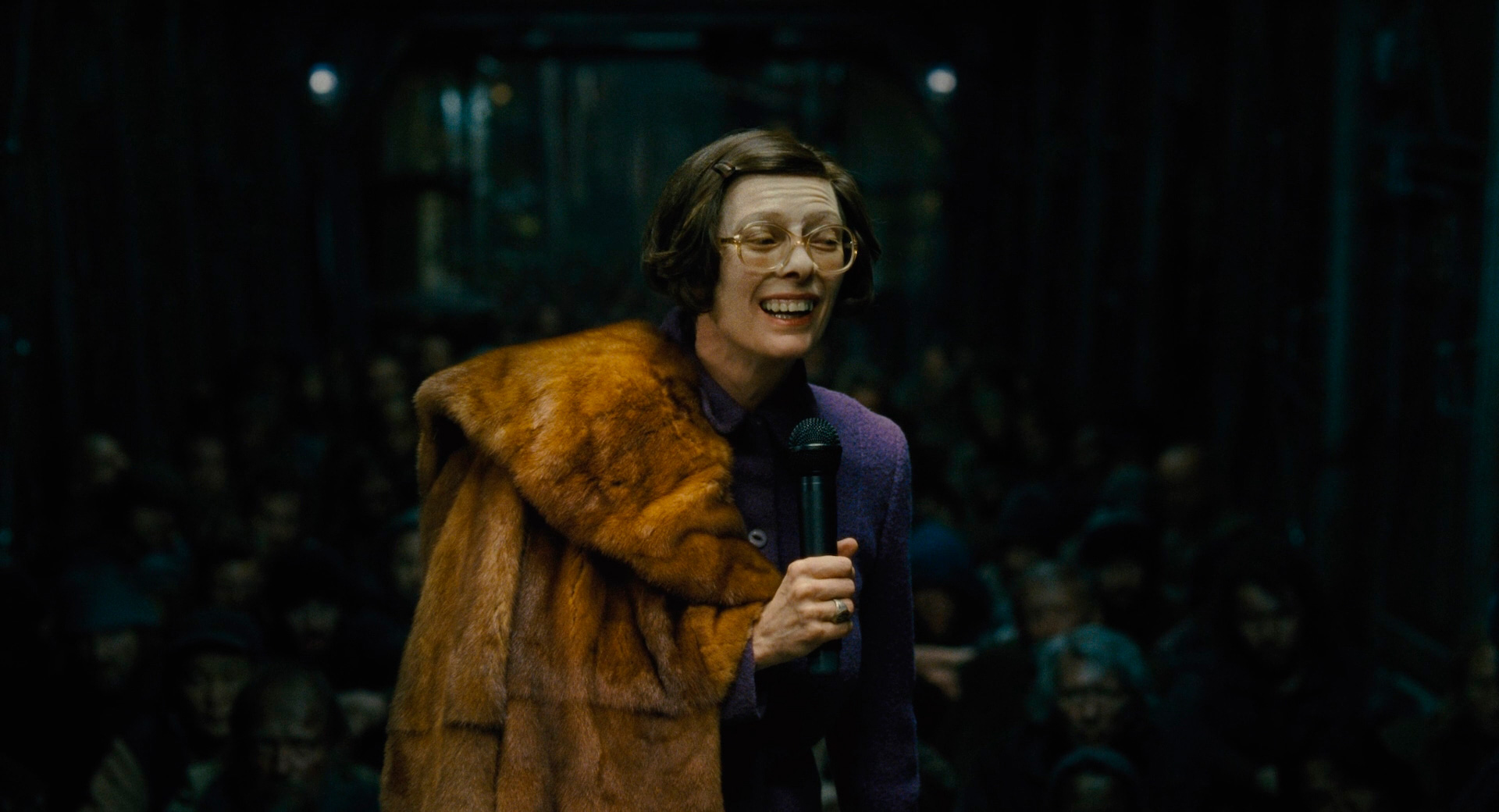Сословные различия, Кертис, готовящий Ля Резистанс и советующийся при этом с мудрым старым Гиллиамом (его сыграл Джон Херт), мерзкая тетка-министр Мэйсон (ее сыграла Тильда Суинтон, и об этой роли мы поговорим ниже), восстание и интересная идея прорваться сквозь двери - примерно три четверти фильма были прямо-таки захватывающими. Давненько я не видел такого эффектного и оригинального фантастического боевика, говорили мы с котом Бубликом сами себе.