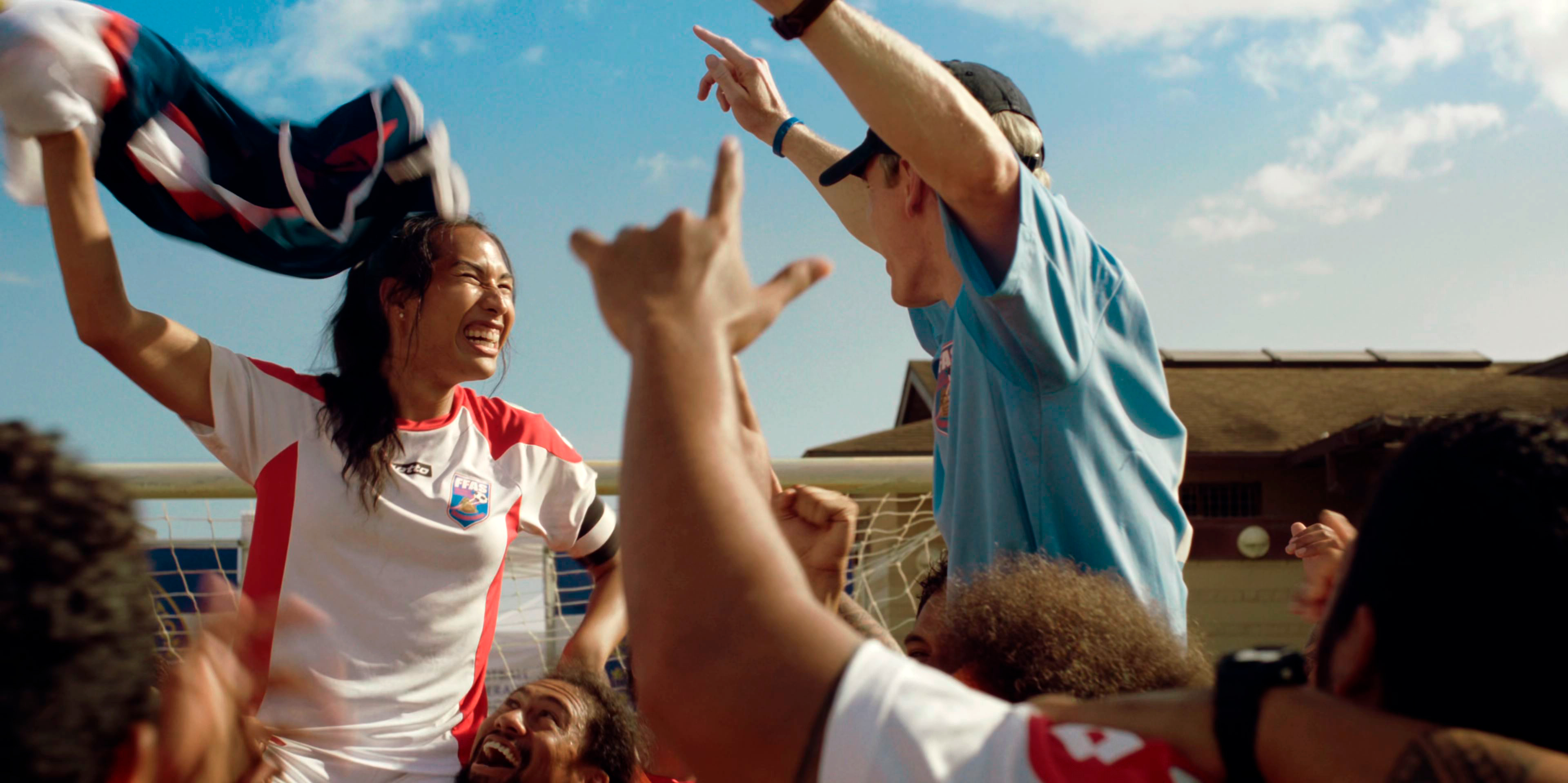 Да, ну и член команды - футболист-трансгендер Джайя Саелуа, первый в мире футболист-трансгендер, принявший участие в Чемпионате мира по футболу, - тоже реальный человек, и его тут сыграла небинарная актриса Каймана. А сама Джайя Саелуа в фильме исполнила несколько футбольных трюков, заменяя Кайману.