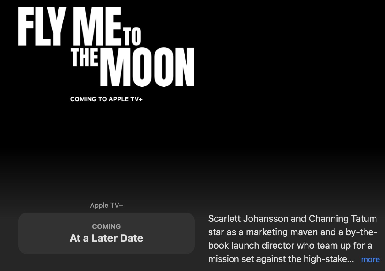 У Эппл вышел очень симпатичный и какой то приятный "To the moon" со Скралетт Йоханссон и Ченнинг Татум. Вот вроде ничего особенного, но как то очень в душу фильм запал.