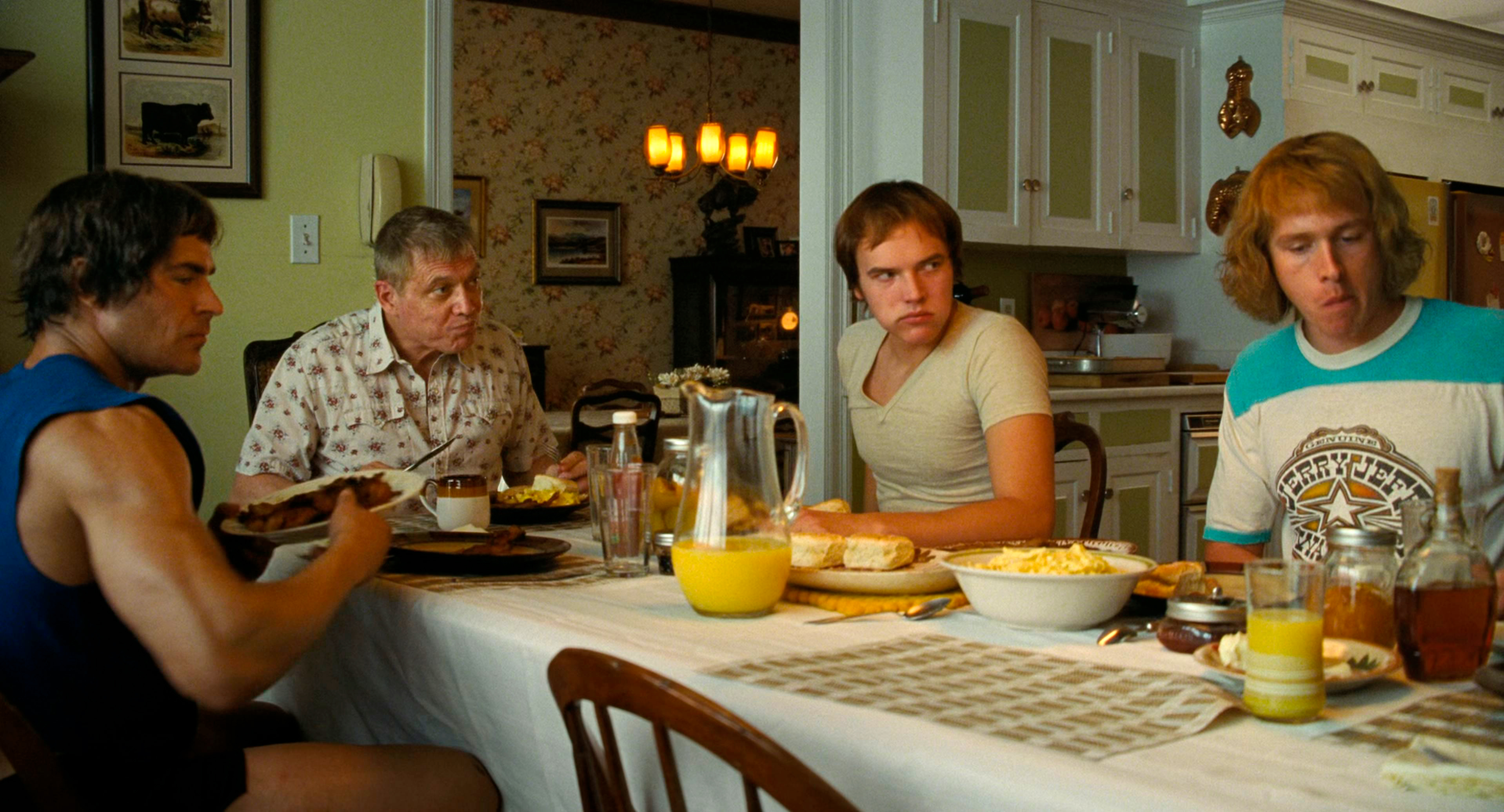 Режиссеру явно важнее было показать постоянное давление отца на своих сыновей, которых он твердо решил вырастить чемпионами, добившимися того, чего он сам не добился, и на этом он и концентрируется. Причем нельзя сказать, что тот же Фриц у него показан таким безусловным домашним тираном, токсичным, как чашка болиголова пятнистого. Нет, он показан человеком, безусловно, очень строгим и жестким, но не жестоким.