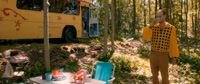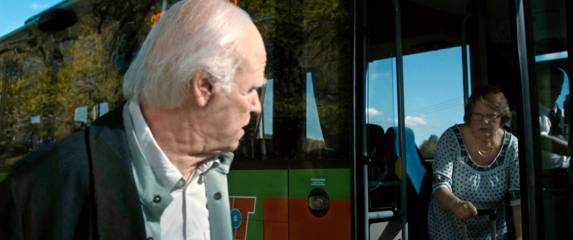 Аллан видит, что его автобус собирается отходить, и вместе с чемоданом садится в автобус.