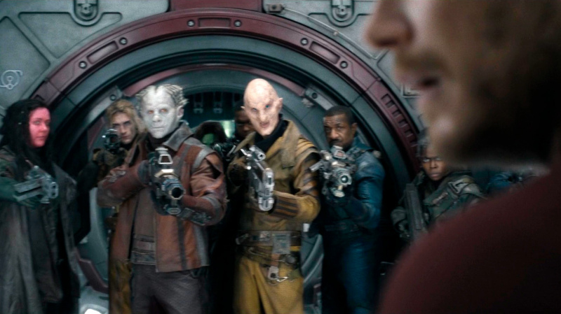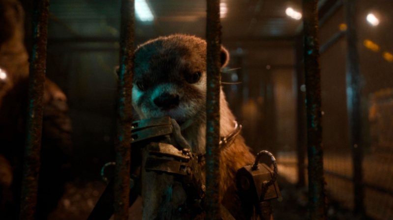 В первых двух фильмах был какой-то злодей, с которым боролись Стражи. Здесь тоже есть явный злодей, с которым им предстоит бороться, но основной упор сделан на историю енота Ракеты, и это показано с должным уровнем драматизма, причем я тут не наблюдаю никакого особенно манипуляторства со стороны создателей картины: по накалу драмы это напоминает скорее четвертую "Историю игрушек" с элементами гениального (безо всяких дураков) мультфильма "Ежик в тумане", только здесь не ежик, а енот в тумане. И его отношения с товарищами по заключению - выдрой, моржом и крольчихой - очень трогательные.