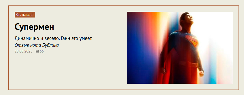 А получилось, на наш с котом Бубликом взгляд, просто отлично - весело, иронично, динамично и забавно. Для меня Супермен как персонаж всегда был довольно скучный, чему способствовали все эти "человеки из стали" и "бэтмены против суперменов", но когда за дело берется Джеймс Ганн, то можно быть спокойным - у него скучно совершенно точно не будет.