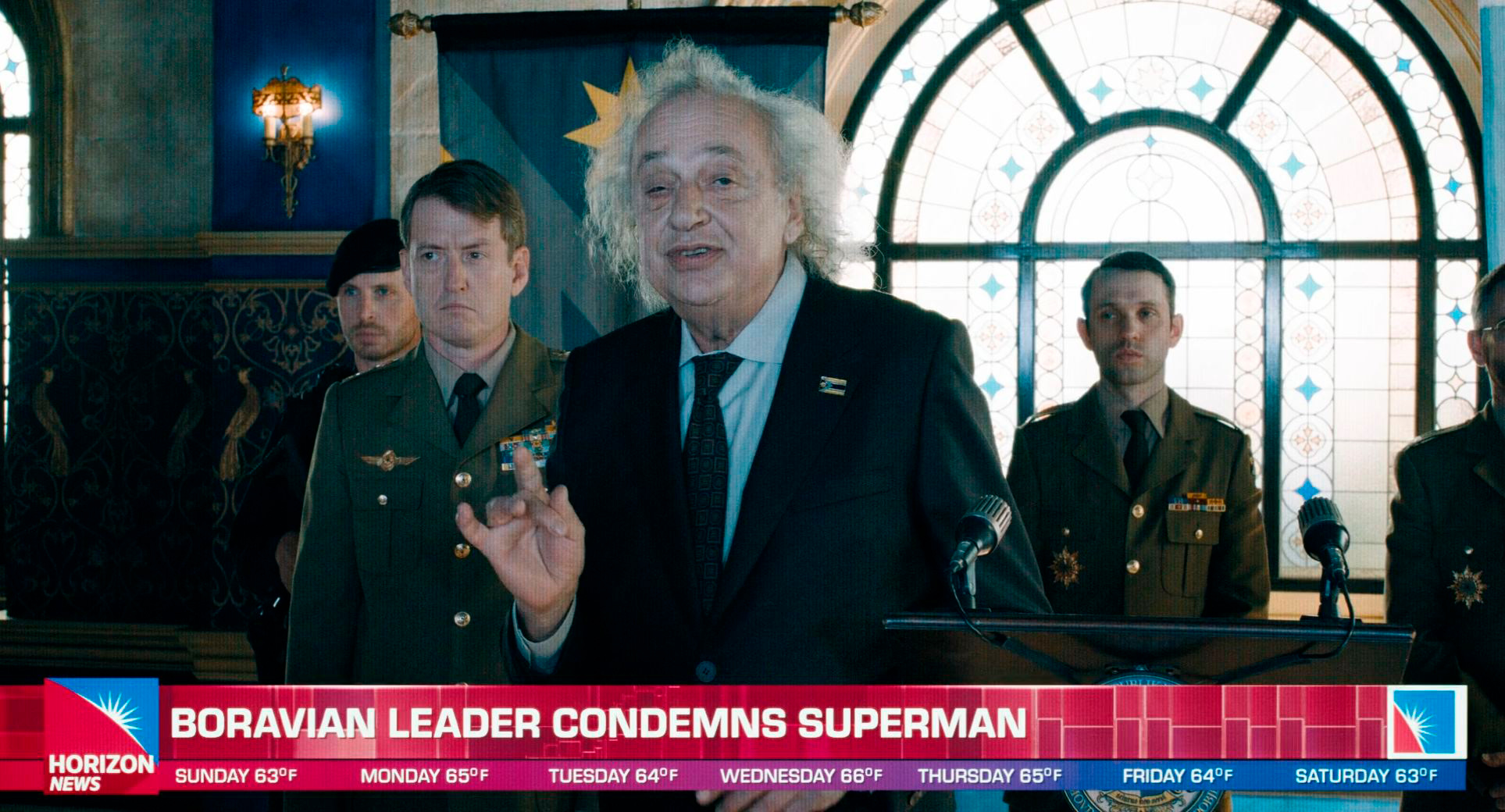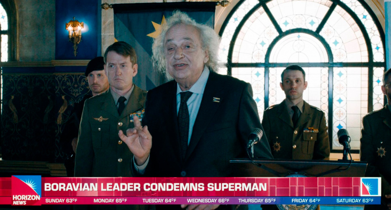 В начале фильма Супермену предстояло остановить военное вторжение Боравии в Джарханпур, но что-то пошло не так: против него выступил гигант Молот Боравии, который, казалось, предугадывает каждое следующее движение Супермена, так что супергерою как следует надавали по ушам.