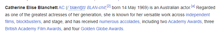 Catherine Elise Blanchett (/ˈblæntʃɪt/ BLAN-chit)