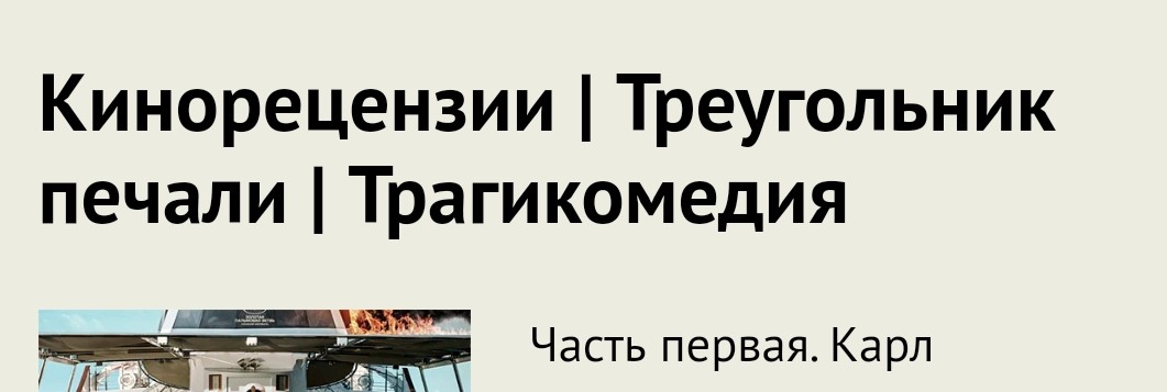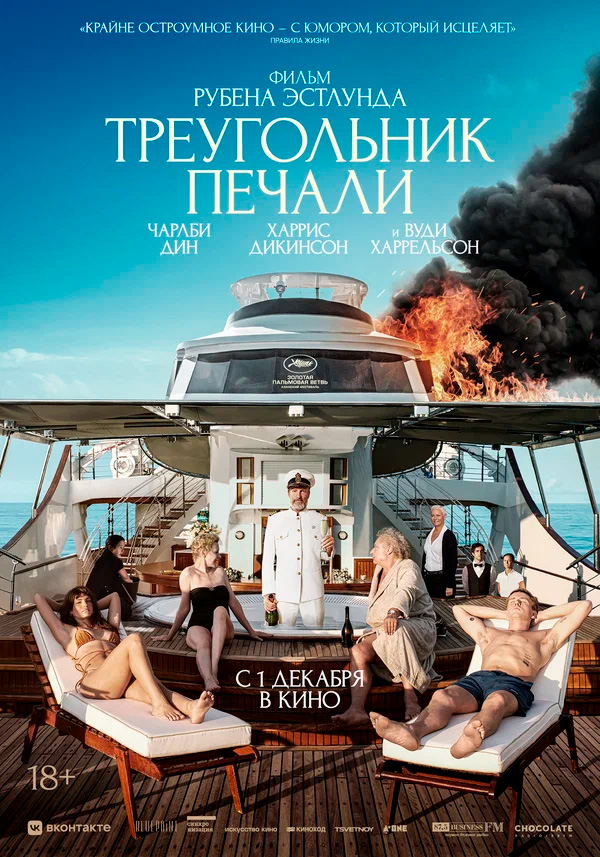 "Треугольник печали" - еще более обласканный критиками фильм данного режиссера. Это первый англоязычный фильм Эстлунда, картина также получила три приза Каннского кинофестиваля, включая золотую пальмовую ветвь, и удостоилась восьмиминутной (время засекали) овации в Каннах по окончании просмотра. И я сразу скажу, что мне этот фильм очень понравился, в отличие от "Квадрата".