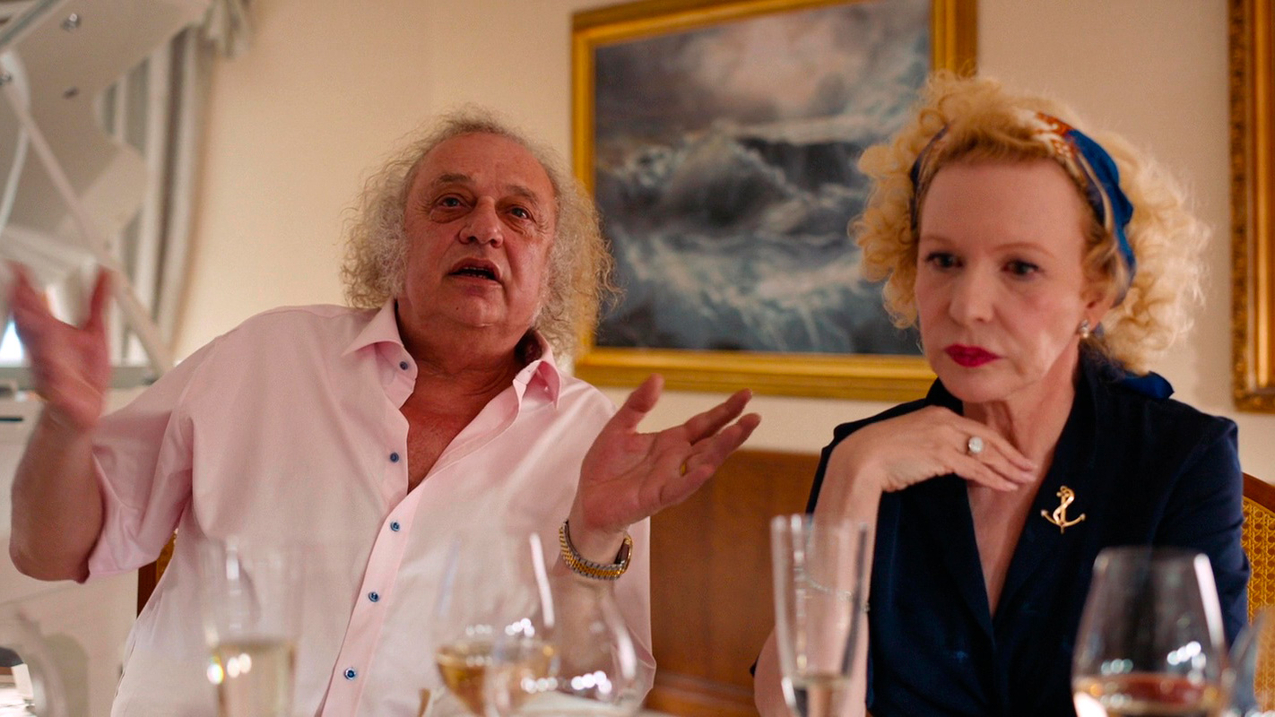 Часть вторая. Та самая яхта. Вышколенный персонал, роскошная еда и напитки, бассейны, солнечные ванны, нега и всяческий расслабон. Кроме Карла и Яйи, которым поездка досталась на халяву, остальные участники - люди очень богатые. Например, русский олигарх Димитрий (Златко Бурич) со своей женой и любовницей. Димитрий сделал состояние на торговле натуральными удобрениями, и он сам о себе говорит: "Я продаю дерьмо".