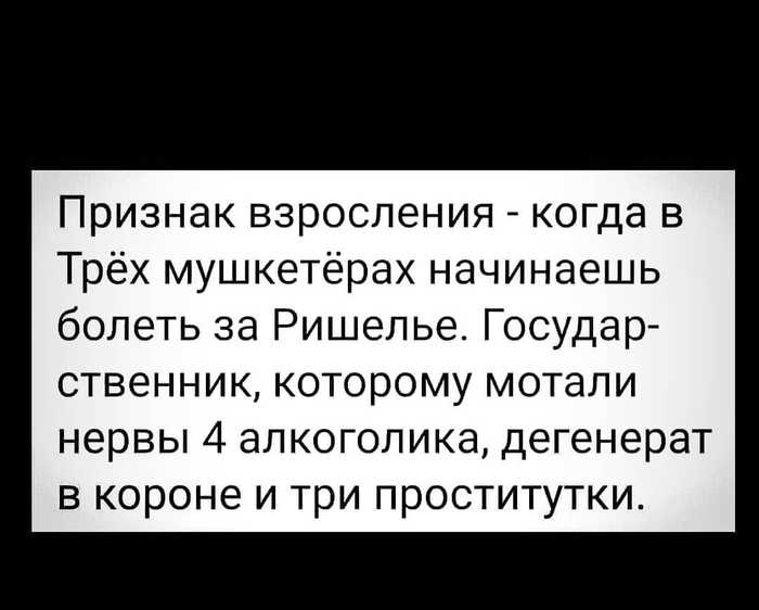 Я пару лет назад такую ошибку сделал. Читал с недоумением и не мог понять от чего я тогда так фанател и почему тот же алконавт Атос был чуть не самым любимым персонажем детства.