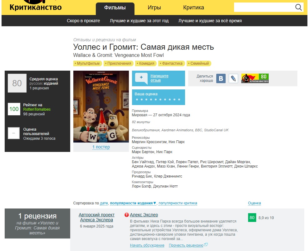 Ну и после этой картины сотрудничество Ника Парка и Aardman Animations с компанией DreamWorks Animation прекратилось. Ник Парк в 2008 году выпустил еще одну короткометражку "Уоллес и Громит: Дело о смертельной выпечке", в 2018 году выпустил полнометражную картину "Дикие предки", которая, на мой взгляд, была вполне неплохой, но при бюджете в $50 млн она по миру собрала всего $54 млн, и это был прям конкретный крупный провал.