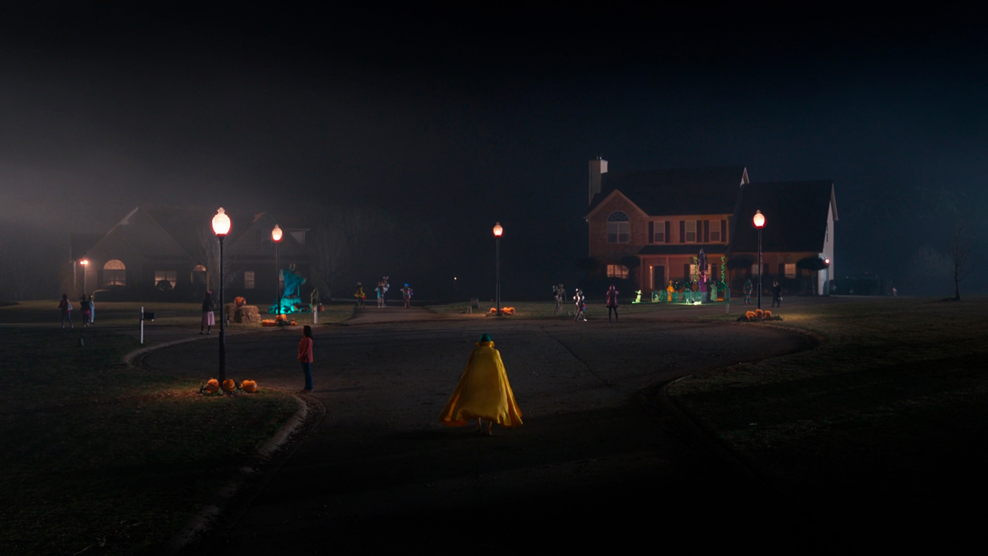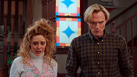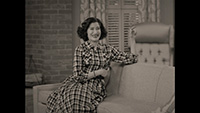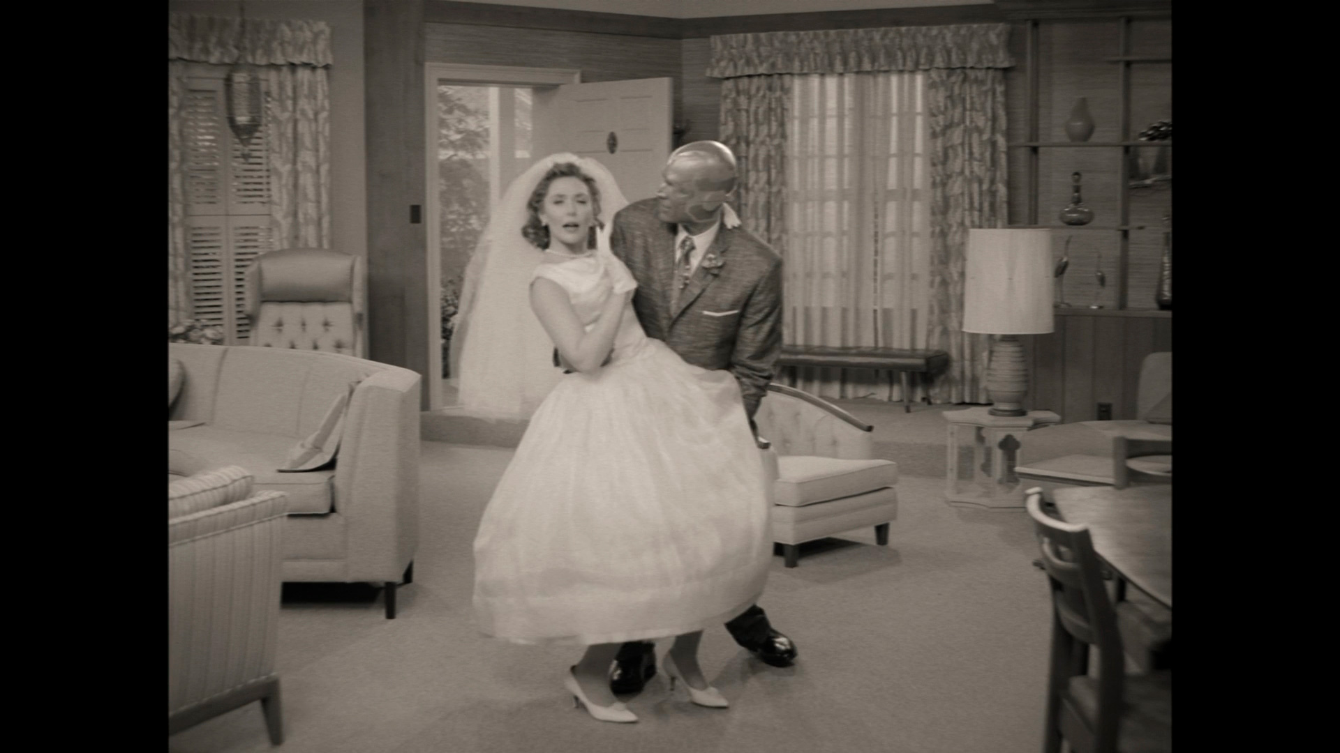 Причем это все первоначально идет в черно-белой гамме, и только в конце второго эпизода появляется цвет, после чего сериал идет уже в цвете. И там практически в каждой серии происходит смена временного промежутка и, соответственно, меняется как стиль постановки, имитируя ситкомы соответствующих годов, так и одежда, а также манера поведения персонажей: Ванды, Вижна, их соседей и других жителей городка Уэствью.