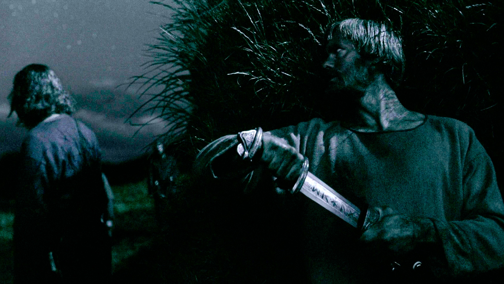 Впрочем, сразу после инициации выяснилось, что не все ладно в викингском королевстве. Брат Короля бастард Фьельнир (Клас Банг) решил собственнозадно сесть на трон, для чего убил Аурвандила, взвалил себе на плечо простоволосую Гудрун в одной ночной рубашке, а инициированного Амлета приказал убить. Впрочем, мальчик оказался шустрый, так что он нанес существенный урон внешности подручному Фьельнира, сел в лодку и уплыл куда глаза глядят.