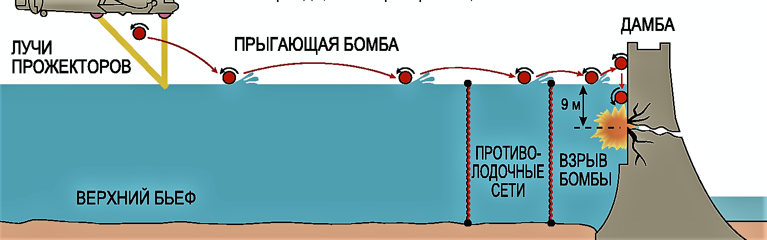 Раскрутка бомб в обратную сторону тросом по желобкам приводила к их прыжкам по поверхности воды. Тоже важное военное ноу-хау, как и наведение самолетов по сходящимся лучам...