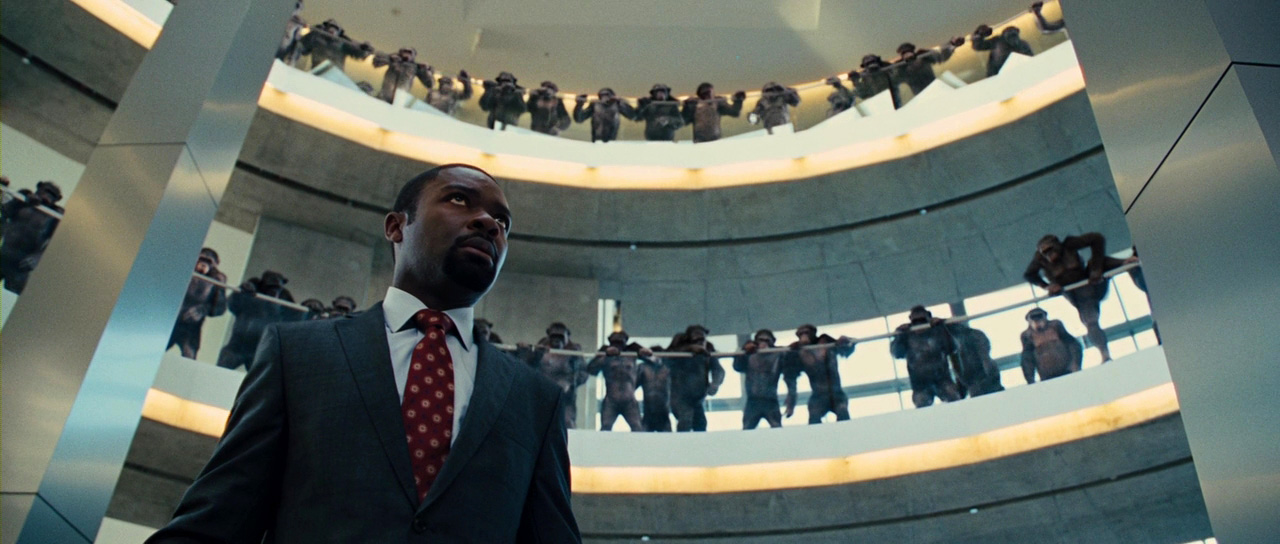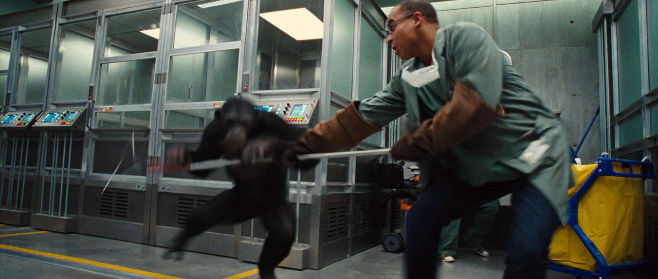 Стивен созывает собрание, но когда подручный Родмана Роберт Франклин (Тайлер Лэбин) пытается вывести шимпанзе из вольера, тот проявляет жуткую агрессию и вырывается на оперативные просторы компании, где его благополучно и пристреливают охранники, ибо обезьяна представляет собой угрозу общественному спокойствию.