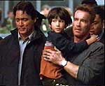 Со стилем они тоже перемудрили. Тут, ребята, одно из двух. Или вы снимаете высокопафосную историю о борьбе с терроризмом, либо же вы снимаете традиционный шварцевский боевичок, где не сильно важно, как ему это все удается сделать, а важно то, как Арни "хитро" прищуривается перед тем, как сломать "главному" шею. В первом случае нужно хоть как-то следить за достоверностью. Потому что иначе пафос пропадает. Во втором случае нужно к черту убирать пафос, который просто неуместен, и следить за Арни, чтобы он в нужный момент поворачивал голову в нужном направлении.