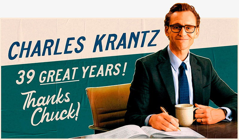 При этом по городу развешано огромное количество биллбордов и плакатов, на которых изображен улыбающийся мужчина в очках и костюме, и там написано: "Чарльз Кранц. 39 отличных лет! Спасибо, Чак!" И даже по радио вещают про эти "39 отличных лет" в качестве рекламы.