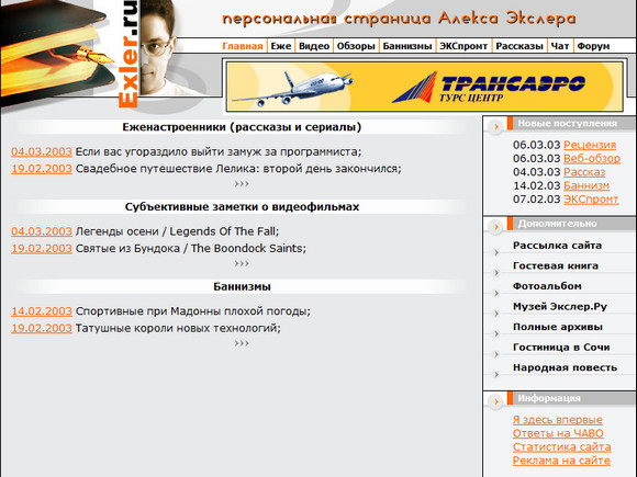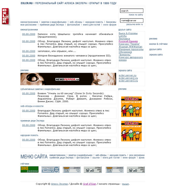 Летом 1999 года мы как-то напились с Норвежским Лесным, в результате чего я собственноручно сотворил новый концептуальный дизайн своего сайта, вызвавший восторг у специалистов. (Тема Лебедев, увидев это дело, сказал: "Go, Exler, go!") Вот эта прелес-с-с-сть!