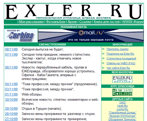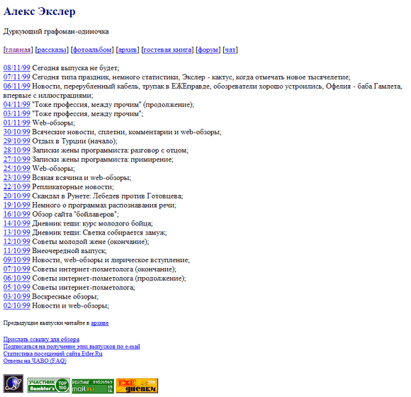 14 января 1999 года был открыт сайт Экслер.Ру в его нынешней ипостаси (то есть с ежедневными выпусками). Я правильно воспринял рецензию Паравозова, поэтому дизайн переделал (опять же - сам) в сторону упрощения и большей функциональности. Получилось тоже кошмарно, но зато читать можно без проблем. Обратите внимание на то, что в первом же дизайне появился культовый для меня зеленый цвет: