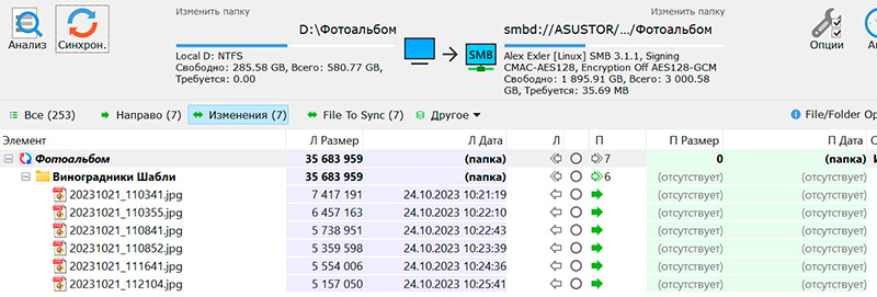 Также обратите внимание на то, что программа умеет очень гибко оптимизировать процесс синхронизации, так что анализ изменений даже на огромных объемах занимает очень незначительное время.