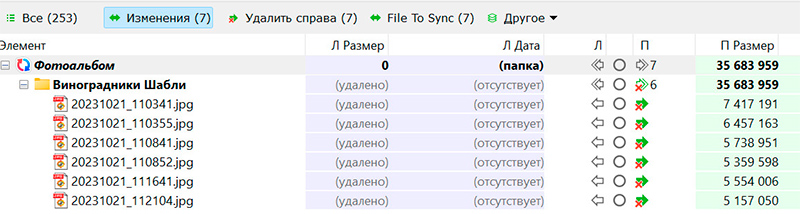Теперь удаляем только что добавленную папку в нашем фотоальбоме. Нажимаем "Анализировать". Система обнаружила, что файлы были удалены и предупредила, что при синхронизации эти файлы будут удалены в папке справа.
