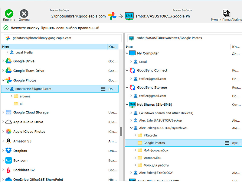 При выборе что исходной, что целевой папки доступна масса всевозможных вариантов: локальные диски, подключенные накопители, сетевые сервисы для Windows и Apple, самые разнообразные облачные устройства.