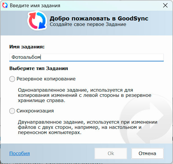 Создаем новое задание синхронизации. Там нужно выбрать: это будет просто резервное копирование или же двунаправленная синхронизация (такое тоже нередко бывает нужно). Выбираем резервное копирование.