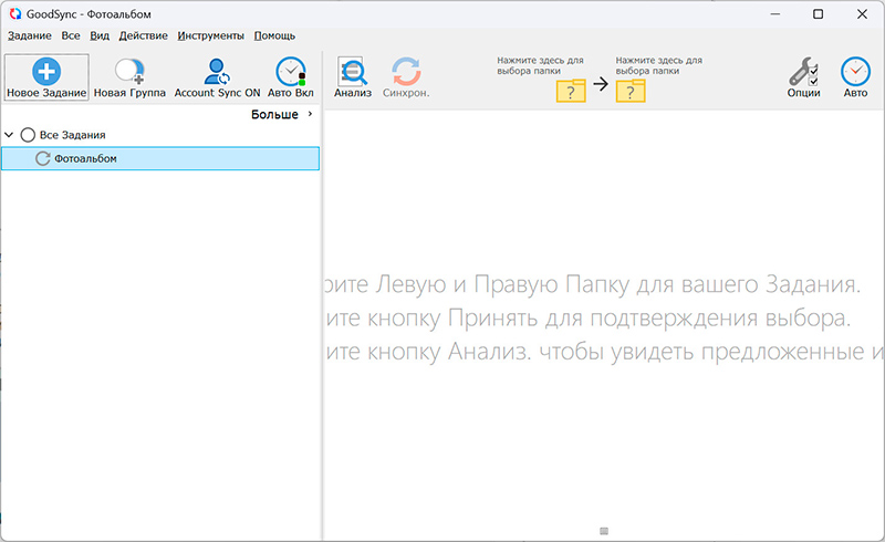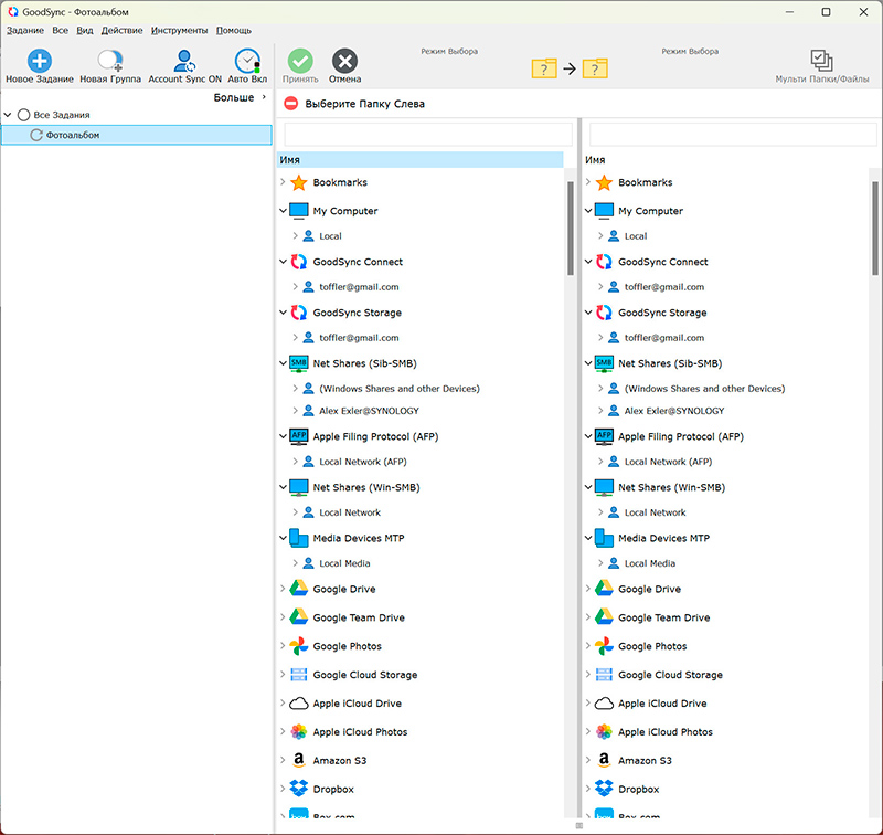 Аналогичным образом создаются другие задания синхронизации. С помощью GoodSync вы можете делать страховочные копии папок и в облачных сервисах (без необходимости копировать папки в папку облачного сервиса на ПК), вы также можете, например, копировать все изображения Google Photos в папку на локальном сетевом накопителе - возможности тут очень большие.