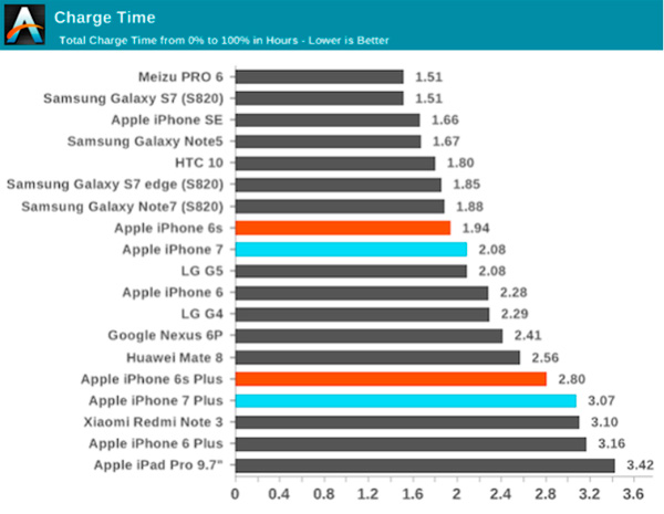 Да, еще хотел показать табличку, сделанную специалистами компании Anandtech. Они вживую протестировали скорость зарядки различных смартфонов на их фирменных зарядках и проводах. Получилась вот такая табличка. Кстати, тут не учитывалась емкость аккумуляторов, а она очень разная, поэтому iPhone SE со своим крохотульным аккумулятором на 1624 мА·ч выбился на третье место. Но вообще айфоны с большими экранами со скоростью зарядки - на последних местах. При этом не сказать, что у них батарея живет дольше, чем у конкурентов. Скорее наоборот: я айфонам супруги три раза аккумуляторы менял.