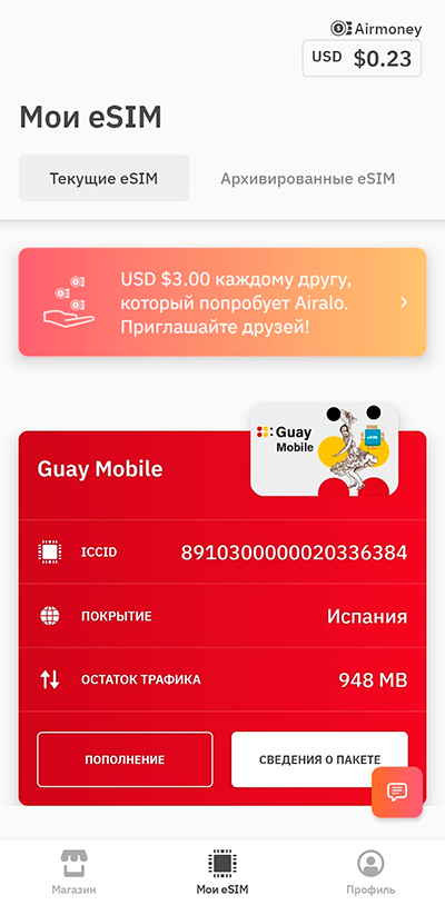 То есть у этого провайдера можно брать eSIM на длительный период и не забивать себе голову. У него удобное приложение, в котором видно, сколько потратили и сколько осталось, и, разумеется, в любой момент там можно докупить желаемый тариф. Более того, и это совсем интересно, если вы зайдете туда по вот этой моей реферральной ссылке, то вам бесплатно дадут eSIM с 500 мегабайтами - чисто на попробовать (и мне при этом тоже 500 МБ добавят, что нелишнее). Я, собственно, именно так себе эту eSIM для теста и установил - по реферральному коду от читателя. Так что попробуйте, денег не просят. Понравится - докупите нужный пакет.