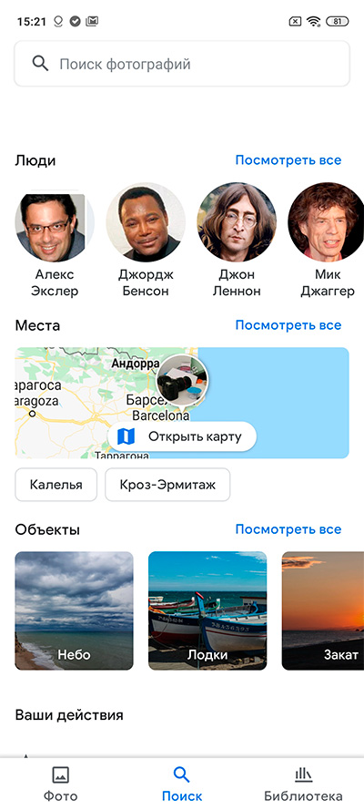 Здесь можно искать фото по каким-то критериям (предметы, места, события и так далее), но главное - сервис сам умеет отслеживать и объединять в группы фото людей (их имена вы, конечно, подписываете сами), фото, сделанные в конкретных местах, группирует фото по объектам (достаточно простым, но тем не менее).