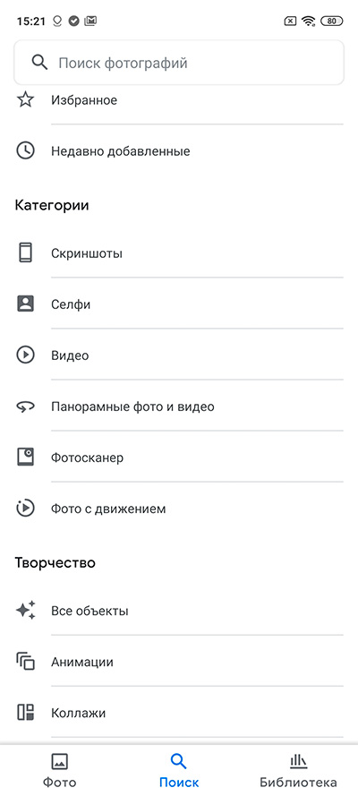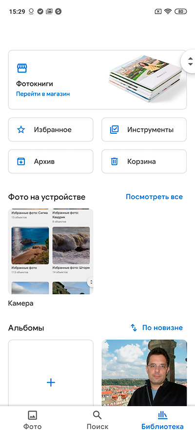 В третьем разделе Google Photos - сервис "Фотокниги" (вы можете заказать печать фотокниги из какого-то вашего альбома, но это работает далеко не для всех стран: например, для России недоступно), избранное, архив, корзина и инструменты.