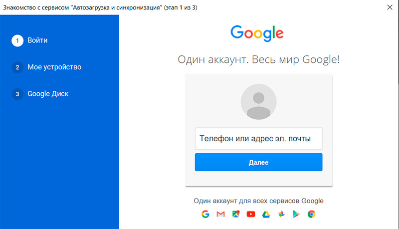 При первом старте программа попросит ввести соответствующий аккаунт Google.