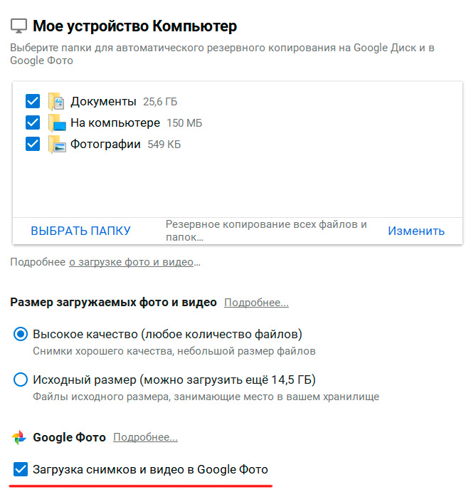 Нужно выбирать первый пункт "Высокое качество", потому что тогда облако для хранения фотографий и видео будет безлимитным. В противном случае бесплатно вам будет доступно только 15 ГБ, а это, скажем честно, очень мало: у меня только фото со смартфона за месяц занимает порядка гигабайта, а уж видео, например, пары детских праздников сразу займет минимум 7-8 ГБ.