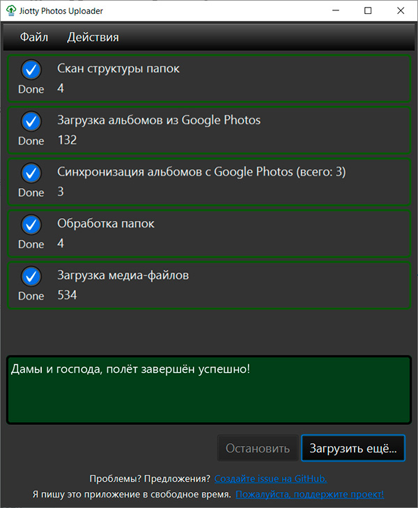 Называется эта программа Jiotty Photos Uploader, я знаю ее разработчика. Он написал ее под свои собственные задачи, а потом, когда выяснил, что такая программа актуальна очень многим людям, выложил ее на GitHub вместе с исходным кодом. И там можно найти версии и под Windows, и под mac OS, и под Linux.