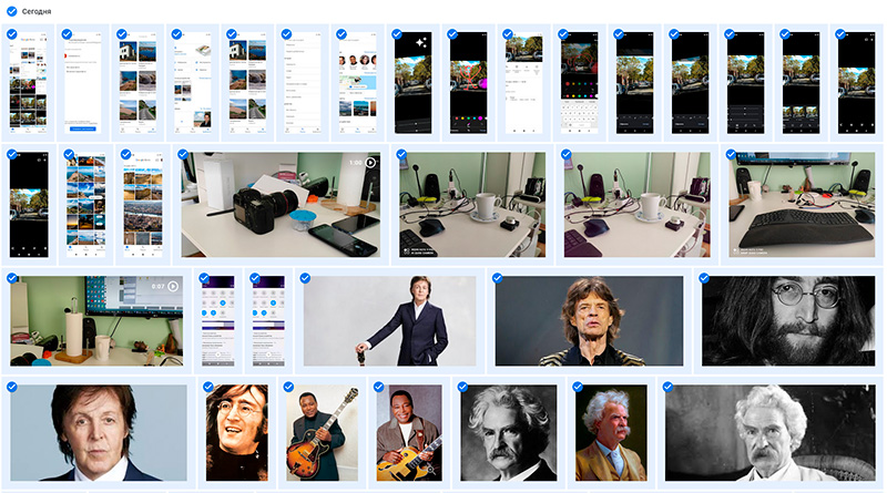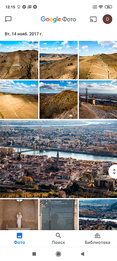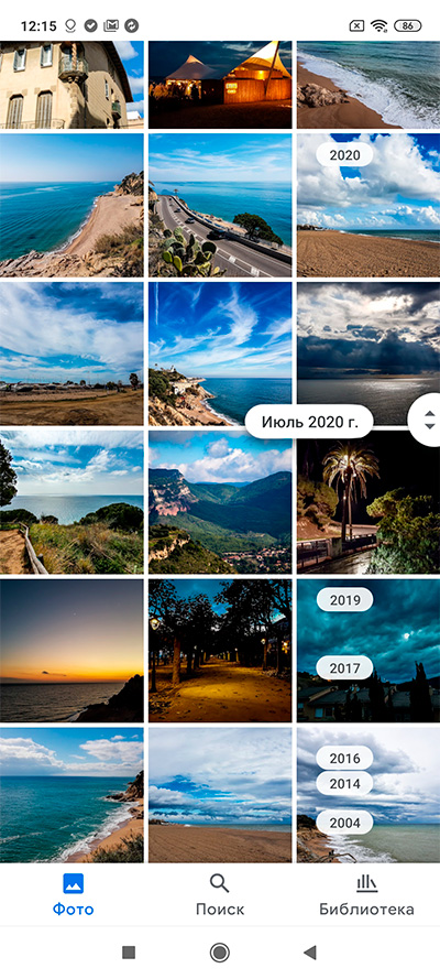 Закладка "Фото" - там показываются фото и видео, сгруппированные по датам съемки.