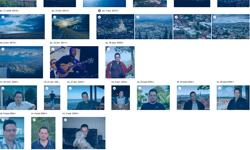 Но на самом деле там есть способ достаточно быстро отметить и удалить большую группу фотографий! Google Photos пишет, что после того как вы отметили какую-то группу фотографий, к ней можно добавить еще какие-то фото, отметив их с нажатым Shift. А лайфхак заключается в том, что если просто прокрутите вниз достаточно большое количество фото (главное условие - их превьюшки должны прогрузиться) и с нажатым Shift отметите только одну нижнюю фотографию, то при этом отмеченными станут все фото, которые вы пролистнули. Видите, на скриншоте все фото приобрели синий оттенок (это просто при наведении курсора на последнюю фотографию)? Это знак того, что если я сейчас щелкну по последнему фото, то все предыдущие будут отмечены!