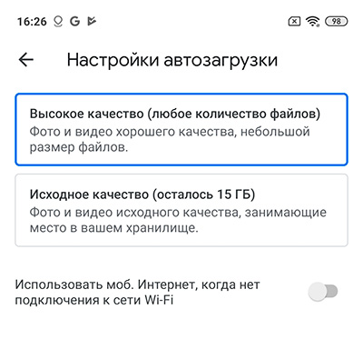Обратите внимание, что, когда вы включаете загрузку снимков в Google Photos, вам предлагают выбрать размер загружаемых медиаданных. И если выбрать "Высокое качество", фото и видео будут загружаться в безразмерное облако.