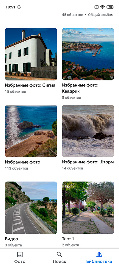 Ниже идет раздел фото на устройстве, еще ниже - все созданные альбомы.