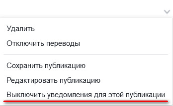 В той самой записи нажать стрелку справа сверху и выбрать "Выключить уведомления для этой публикации".