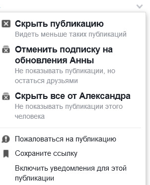 Например, у вас есть френд, чьи посты в Facebook вы видеть не хотите, но из френдов убирать его также не собираетесь. Нет проблем: на любом его посте нажмите стрелку справа сверху и отпишитесь от его публикаций.