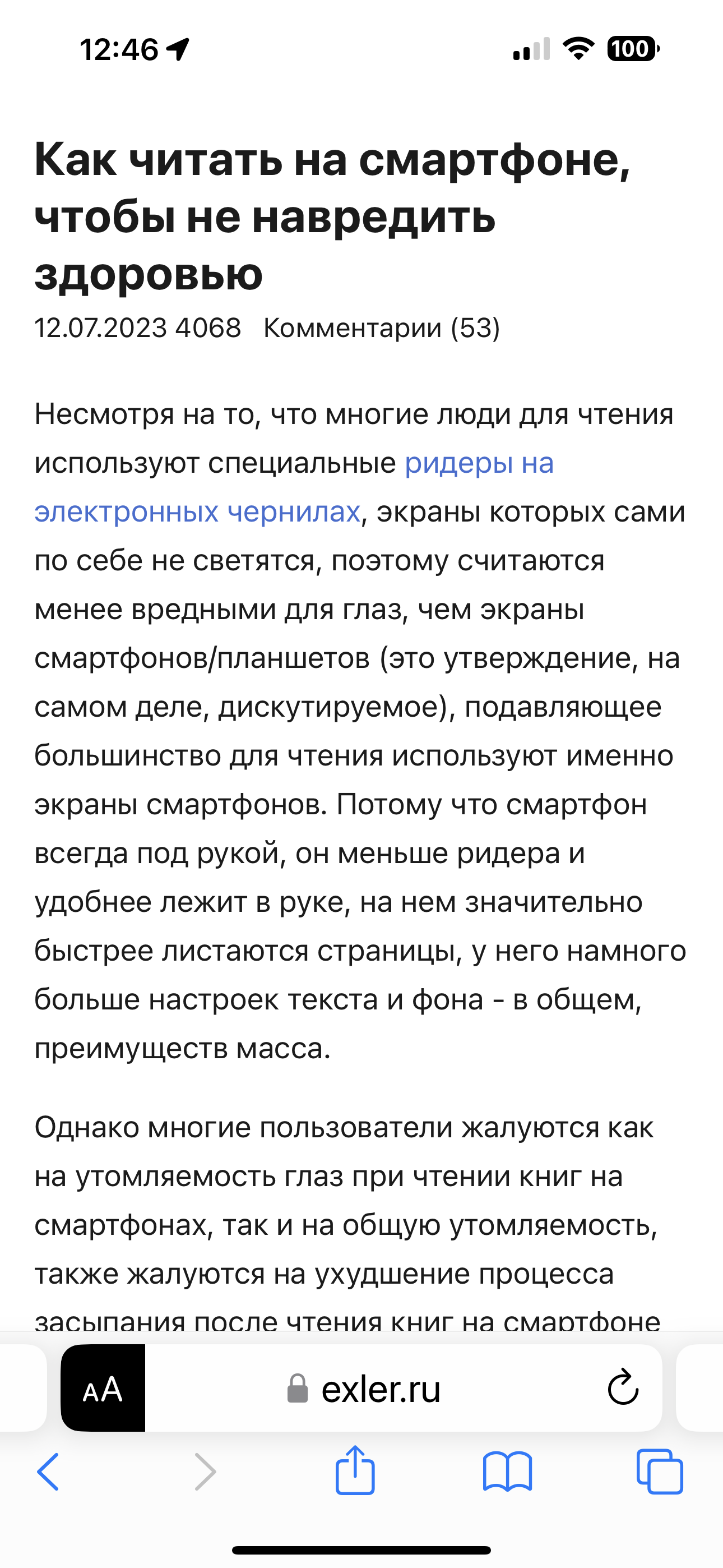 Несмотря на то, что многие люди для чтения используют специальные ридеры на электронных чернилах, экраны которых сами по себе не светятся, поэтому считаются менее вредными для глаз, чем экраны смартфонов/планшетов (это утверждение, на самом деле, дискутируемое), подавляющее большинство для чтения используют именно экраны смартфонов. Потому что смартфон всегда под рукой, он меньше ридера и удобнее лежит в руке, на нем значительно быстрее листаются страницы, у него намного больше настроек текста и фона - в общем, преимуществ масса.