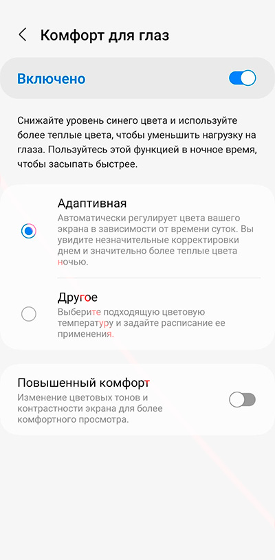 И в самой операционной систем Andorid, и в прошивках смартфонов почти всех производителей есть специальный режим для чтения. Он может называться по-разному. "Режим чтения" в самом Android, "Комфорт для глаз" у Samsung и так далее.