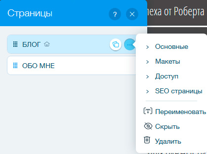 Слева сверху располагается выпадающее меню навигатора страниц сайта, чтобы вы могли перемещаться между страницами и редактировать их. На данный момент у нас там две страницы - главная и раздел "Обо мне".