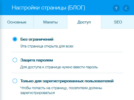 Для страницы вы можете задавать макет (разметку) и, что интересно, ограничивать виды доступа.