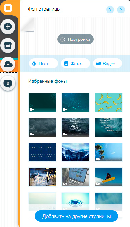 Разделы редактора слева. Первый раздел - редактирование фона страницы. Вы можете выбрать цвет, изображение, свое изображение и даже видео (очень модная нынче тема - видео в качестве фона сайта).