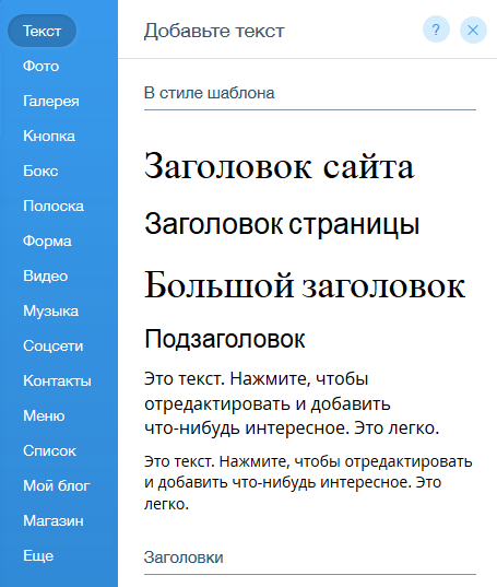 Следующий раздел - добавление различных элементов. Это может быть текст, фото, кнопка, форма, видео, меню и так далее и тому подобное.