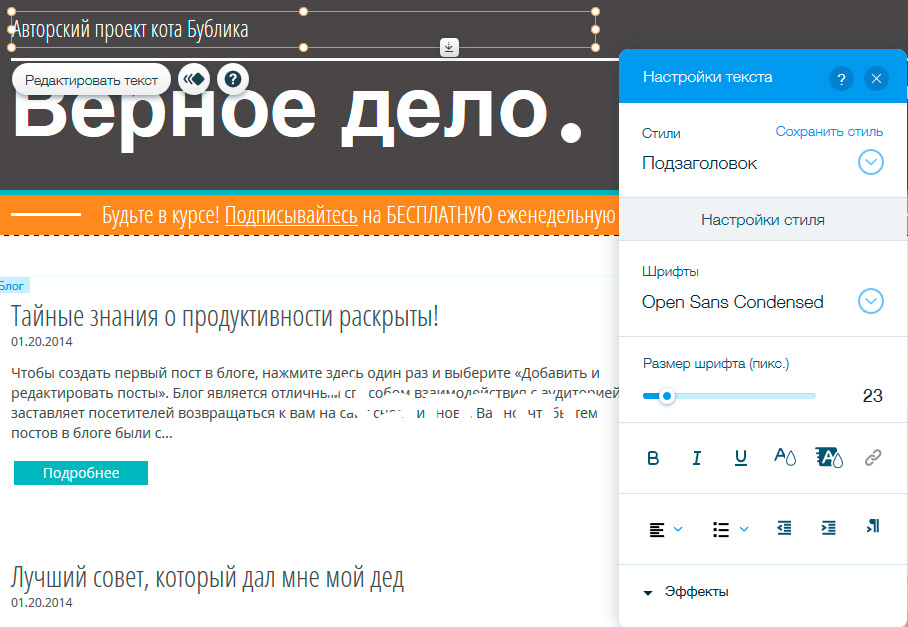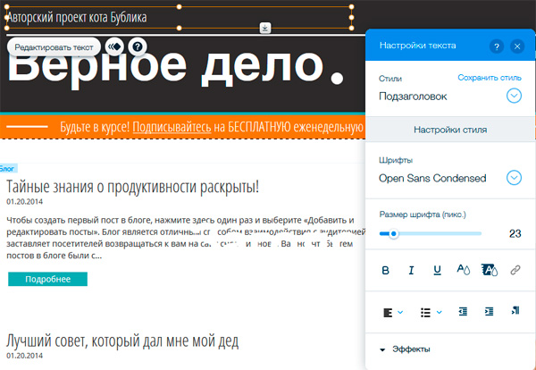 Уже созданные элементы шаблона с легкостью редактируются - достаточно просто по ним щелкнуть мышкой. Например, вот редактирование заголовка.