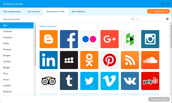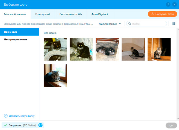 Там вы можете загрузить свои изображения (и разложить их по папкам для удобства), взять какие-то изображения из ваших альбомов в соцсетях, загрузить изображения из большого бесплатного каталога Wix или купить изображения со скидкой на Bigstock.