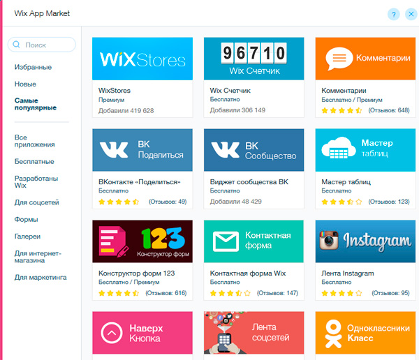 Третий раздел Wix App Market. Он содержит специальные приложения (платные и бесплатные), с помощью которых вы можете значительно расширять функциональность своей страницы. Тут есть счетчики, формы, галереи, элементы для интернет-магазина, маркетинга, для взаимодействия с соцсетями и так далее и тому подобное.
