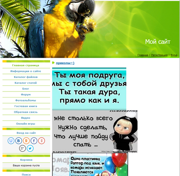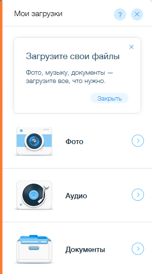 Четвертый раздел - мои загрузки. Сюда можно загружать любые файлы, которые вы собираетесь разместить на странице: фото, видео, документы и так далее. (Тут следует помнить о том, что место, предоставляемое для файлов вашего сайта, ограничено, поэтому не надо туда заливать все подряд.)