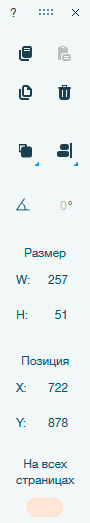 При выделении любого элемента на странице активируется специальная панель инструментов. С ее помощью вы можете копировать элемент, дублировать, удалять, выравнивать, перемещать на задний план, поворачивать и размещать элемент сразу на всех страницах.